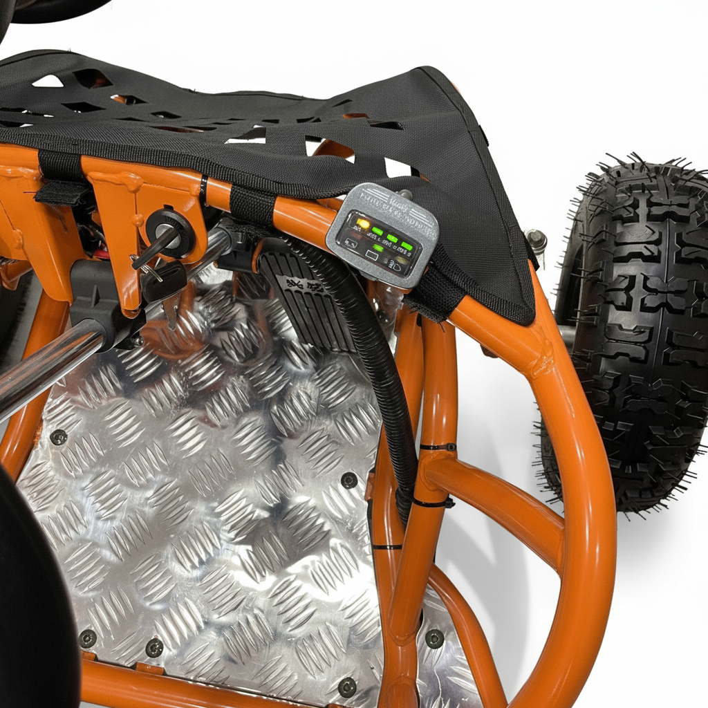 De Elektrische buggy EXTREME ! Nu beschikbaar bij CarKiddo in het oranje en zwart! Deze elektrische kinderbuggy is een unieke verschijning. Met zijn 48V accu en 1000W sterke motor is de buggy ideaal om er zowel off-road als on-road mee te rijden. Perfect voor bijvoorbeeld een dagje naar het strand of op het asfalt! Super snel en super sterk zijn de voornaamste eigenschappen van de buggy. . De elektrische buggy heet een maximale snelheid van circa 30 kilometer per uur. De snelheid is makkelijk en snel te begrenzen door het knopje op het dashboard in te drukken, begrensd heeft de buggy een maximale snelheid van ongeveer 10-15 kilometer per uur. De stoel van de buggy is te verstellen op maar liefst 5 verschillende standen. Tevens zorgen de gordel en kooi rondom de buggy voor een veilige rit. De buggy is voorzien van rubberen luchtbanden voor extra comfort en grip. Met de elektrische buggy EXTREME steel je pas echt de show!