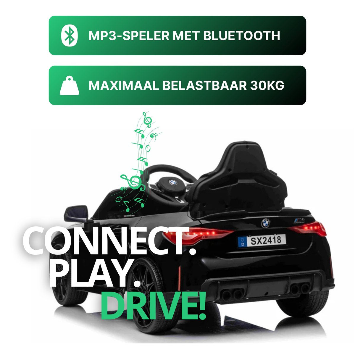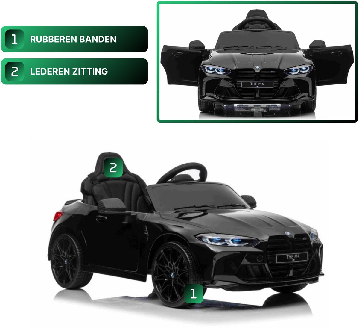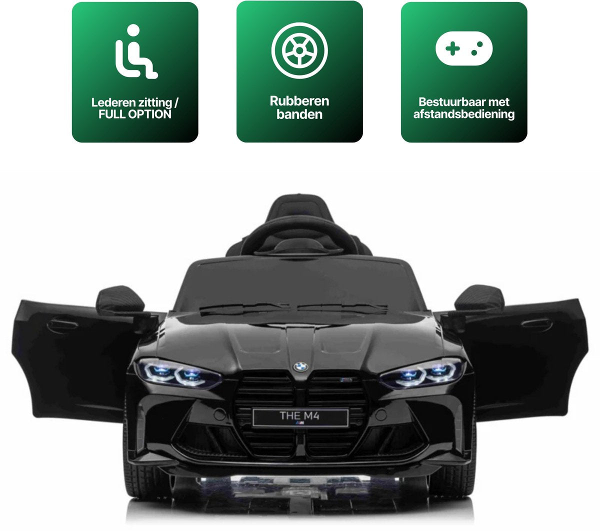 Met deze metallic zwarte BMW M4 kinderauto maak je indruk. Dit 1-persoons model is voorzien van verlichting, soft start en een claxon. Hierdoor is deze kinderauto altijd zichtbaar en hoorbaar. Je kindje zal ongelofelijk blij zijn met dit cadeau. Daarom koop je deze BMW M4 Elektrische Kinderauto metallic-zwart bij CarKiddo. Extra leuk is dat je een kenteken op maat kan laten maken, bijvoorbeeld met de naam van je kindje.