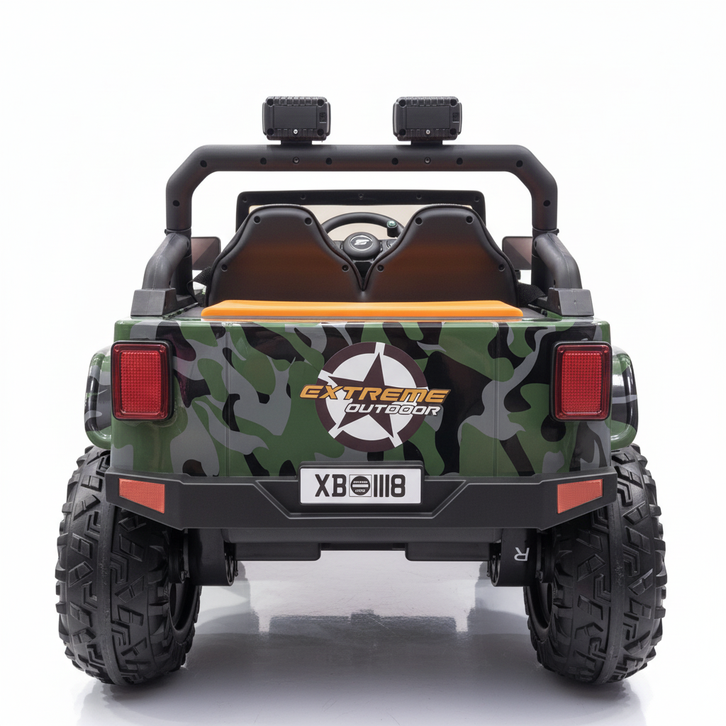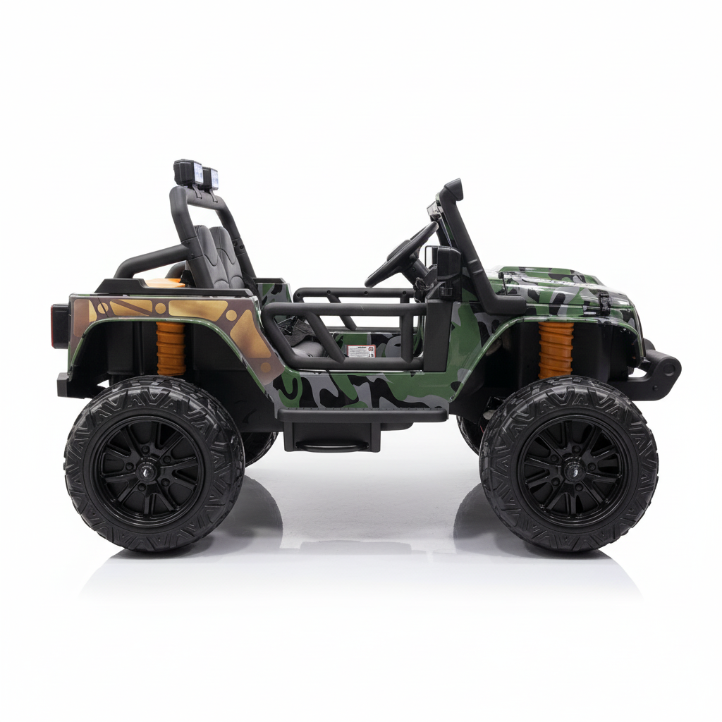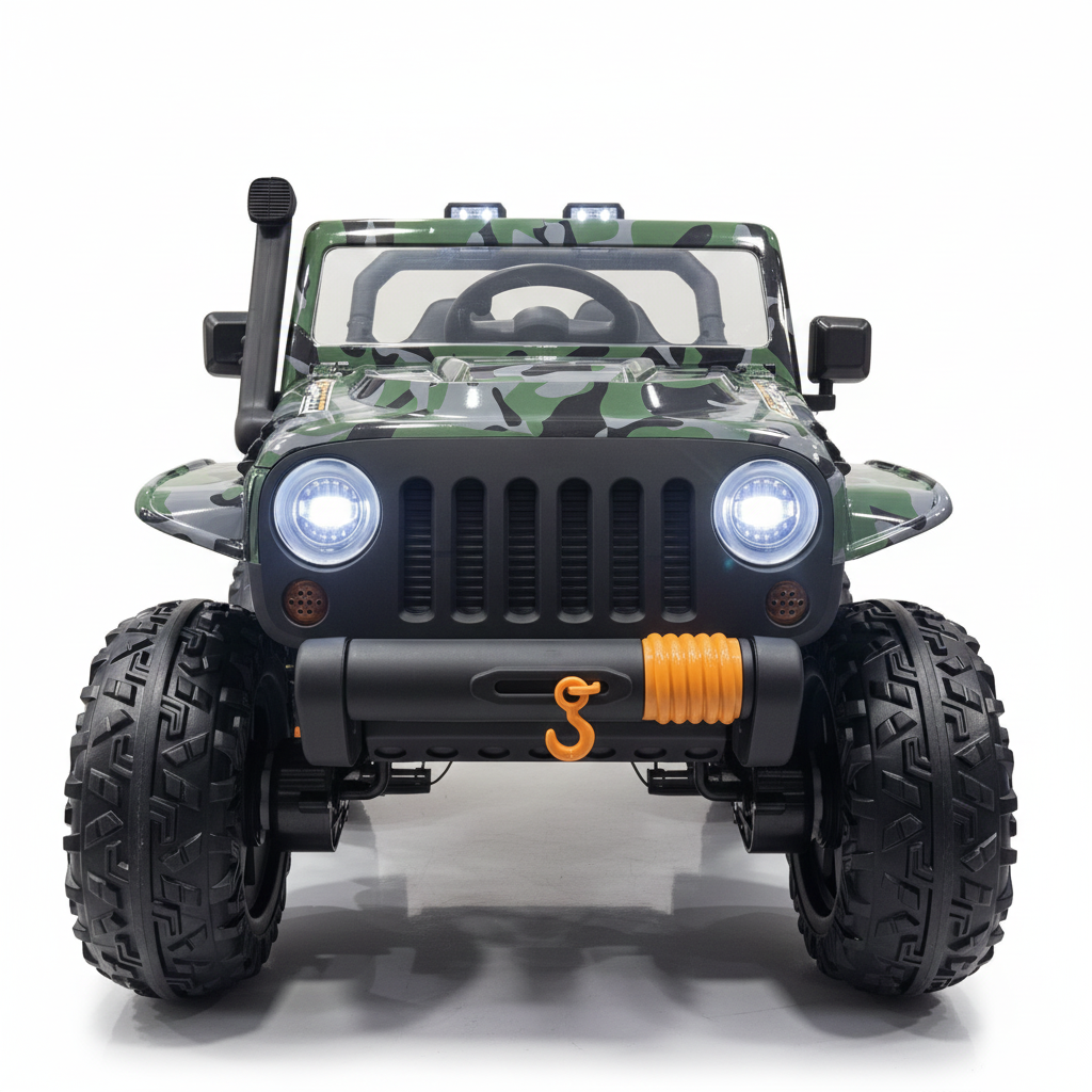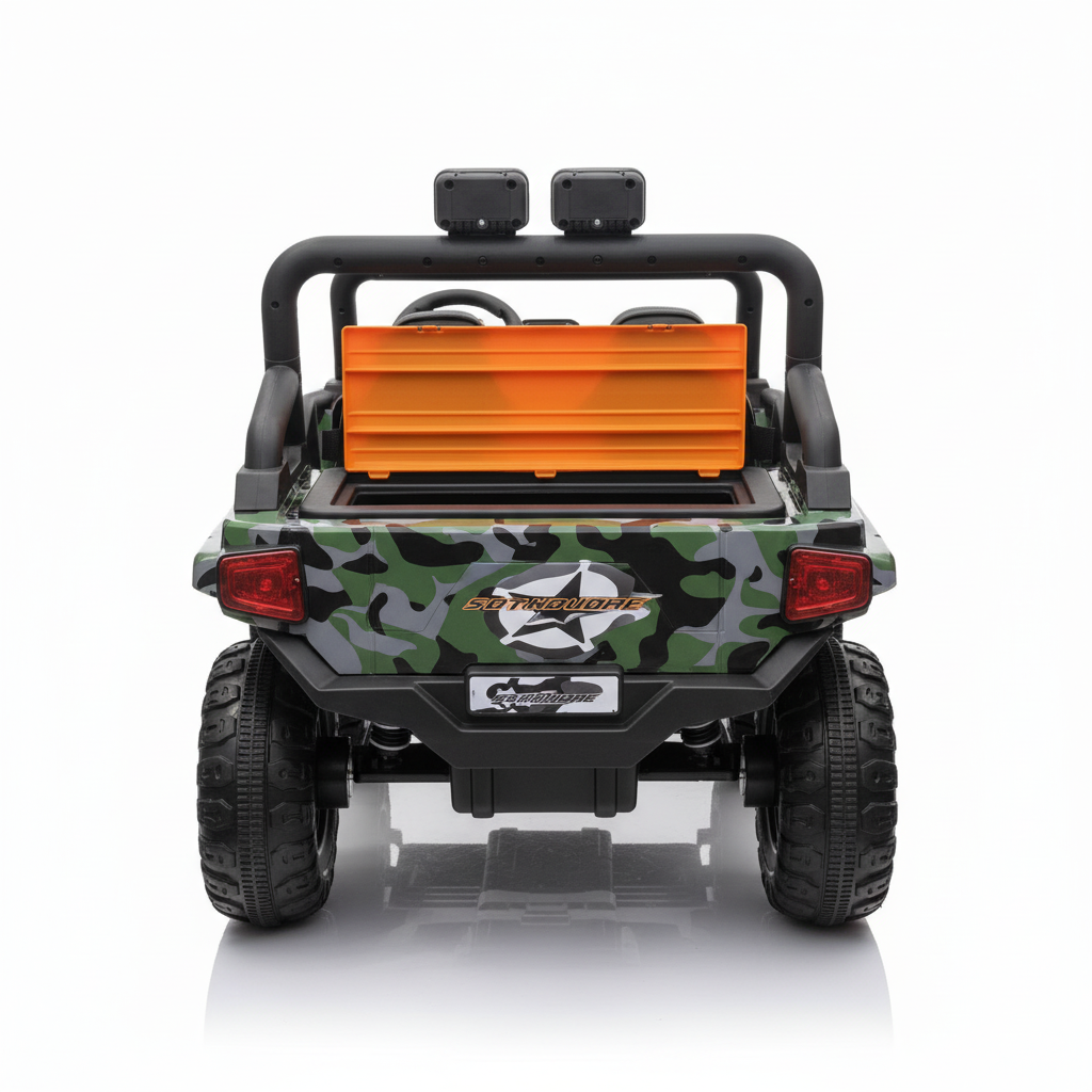 Deze Gladiator kinderjeep beschikt over opbergruimte. Je kindje kan hierdoor bijvoorbeeld een knuffel of ander speelgoed meenemen voor onderweg. Voor en achter is dit model van Ledverlichting voorzien, zodat de kinderjeep ook in het donker goed zichtbaar blijft. De prachtig glanzende camouflage lak met oranje accenten maakt dit tot één van de mooiste kinderauto’s van dit moment. Een sleutel, die je kunt gebruiken om de jeep te starten, wordt meegeleverd. Tijdens het cruisen kan jouw kindje luisteren naar liedjes en verhaaltjes dankzij de ingebouwde MP3 speler.