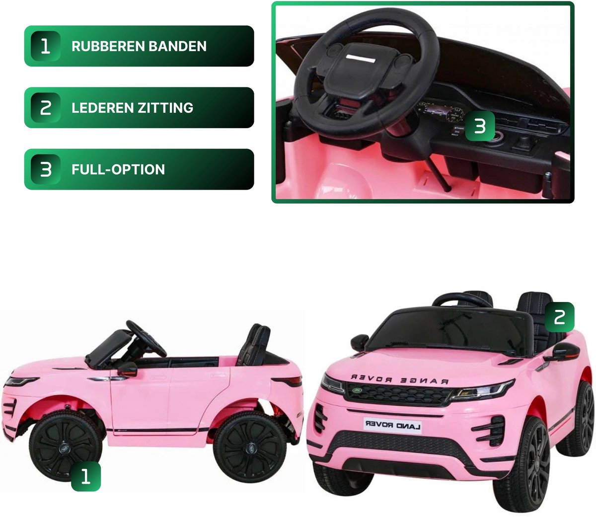 De Range Rover Evoque kinderauto beschikt over rubberen banden, dit zorgt voor een comfortabele rit. Daarnaast beschikt deze kinderauto over een mooie bijpassende leren stoel. De stoel is uitgerust met een gordel die je gemakkelijk kunt afstellen.