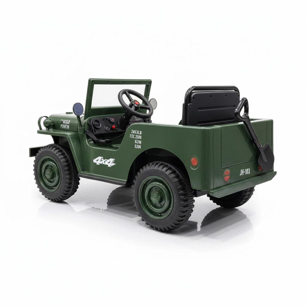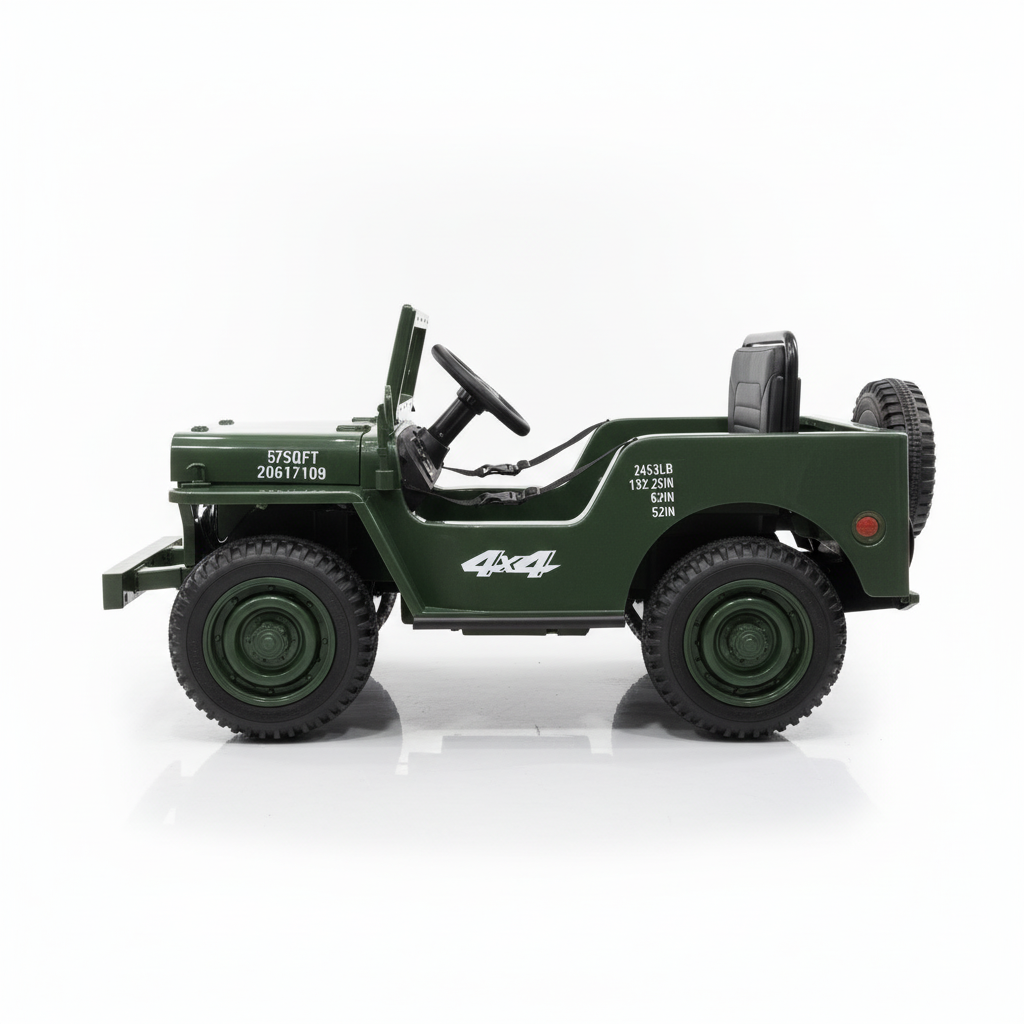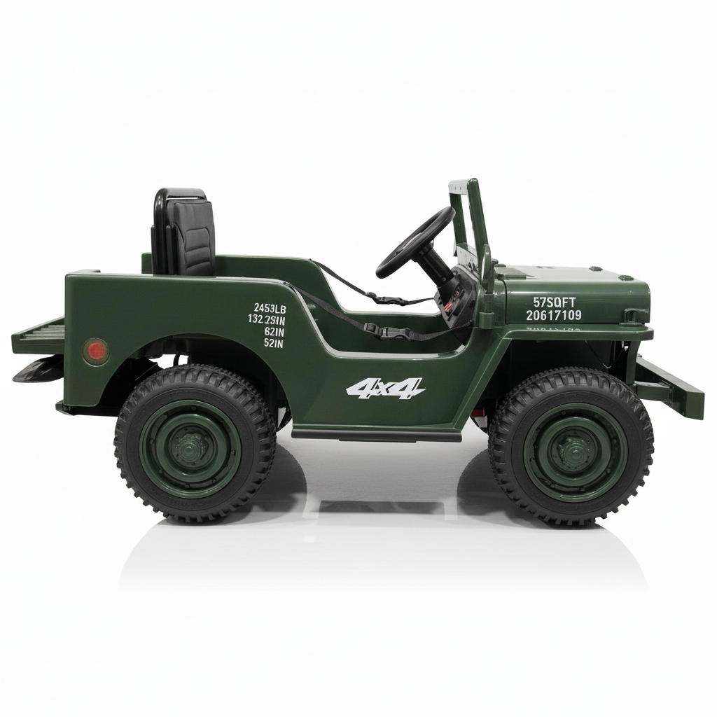 Vanaf nu is deze Willy kinderjeep 1-persoon bij ons verkrijgbaar in de kleuren Matcha (donkergroen) & Khaki (beige/zand). Deze elektrische kinderjeep van Willy’s is gebaseerd op de iconische jeep die je wellicht wel kent uit films zoals Jurassic Park en Rambo. Daarnaast was de Willy’s jeep het icoon van het Amerikaanse leger tijdens de jaren 40. Deze iconische jeep is er nu ook voor kinderen. Hierbij gaat het om een kinderjeep die volledig elektrisch is. De Willy's jeep bij CarKiddo is uniek en FULL-option uitgevoerd met onder andere een 12V accu, vierwielaandrijving, lederen zitting en rubberen banden. Dit is de 1-persoons uitvoering!