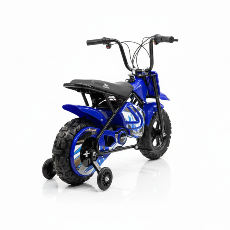 Deze Elektrische minicross bike 24V Blauw is nieuw in ons aanbod en geschikt voor alle beginnende crossertjes. De vormgeving ziet er fantastisch uit dankzij de combinatie van blauwe en zwarte kleuren. Zo ontstaat er een stoere kindermotor waarmee je kind gezien mag worden. Maar er zijn nog meer redenen om voor deze blauwe elektrische kindercrosser te kiezen. Zo beschikt dit model over afneembare zijwielen, een brushless motor en een 24V accu, waarmee het de ultieme elektrische crosser is voor de allerkleinste. Daarom bestel je dit model bij CarKiddo. Liever een maatje groter met meer vermogen? In dat geval kies je voor deze Elektrische Kindercrosser 1000W Oranje.