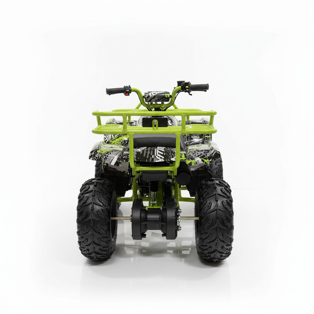 Deze elektrische kinderquad is groen van kleur voorzien van een speciale print. Dit ziet er fenomenaal uit. De stoere uitstraling wordt nog eens versterkt dankzij de felle ledverlichting. Bijkomend voordeel van deze verlichting is dat de quad te allen tijde goed zichtbaar is. Deze kinderquad kan zowel voor- als achteruit rijden en het is een fluitje van een cent om deze kinderquad te bedienen. Deze 1000 watt brushless kinderquad heeft ook een neutrale stand. De maximale snelheid van deze elektrische kinderquad is 30 km/u. Je kunt de maximale snelheid ook instellen op 5 km/u of 15 km/u met behulp van de uitneembare sleutel. Zo behoud je als ouder zelf de controle. De bagagedrager voor en achter is perfect voor het vervoeren van diverse spullen.